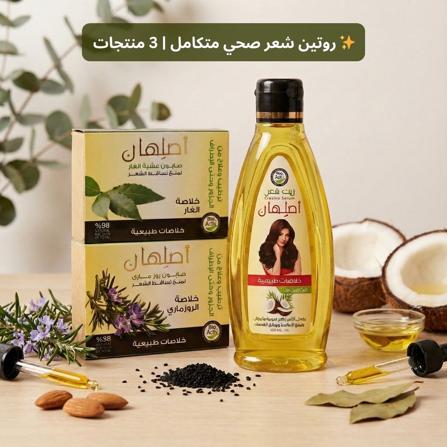 - زيت أصلهان (180 مللي): تركيبة زيوت طبيعية غنية تغذي الشعر بعمق، تحميه من التقصف والجفاف، وتعيد له الحيوية.