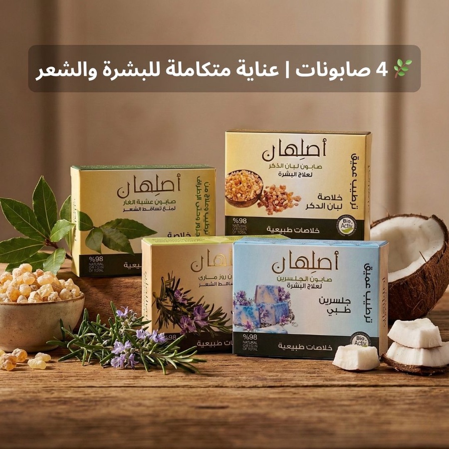 مجموعة من 4 صابونات طبيعية لتمنحك روتين عناية متكامل من الطبيعة، حيث تضم صابونتين مخصصتين للبشرة وصابونتين مخصصتين للشعر، لتغطية أهم احتياجات العناية اليومية. تعتمد المجموعة على زيوت طبيعية بالكامل، جلسرين طبي، ومكونات فعالة تساعد على تحسين صحة البشرة وتقوية الشعر من الجذور حتى الأطراف، مع استخدام آمن ومناسب للجميع.